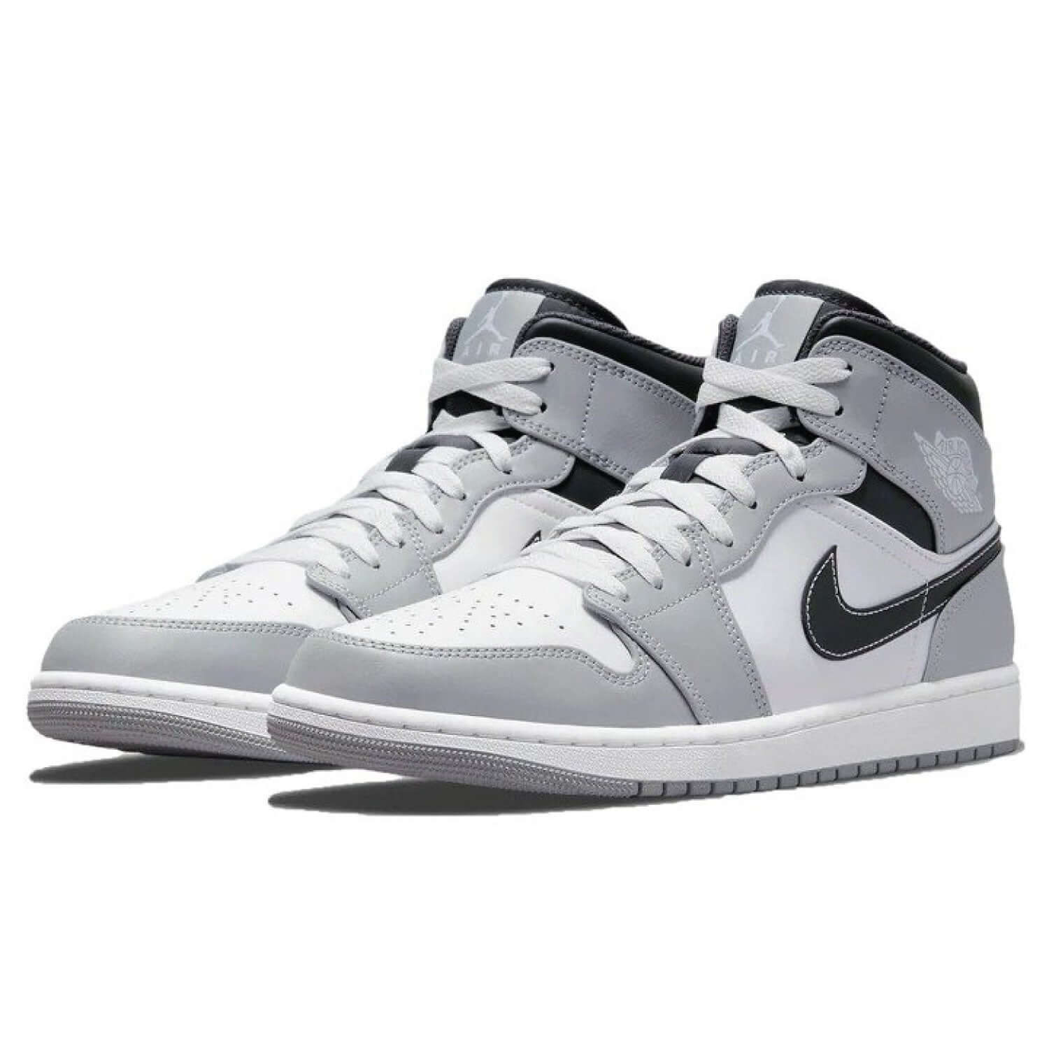 The Jordan 1 Mid "Light Smoke Grey has a sleek, versatile look. Suitable for every sneaker collection. These mid-top sneakers feature a sleek white leather upper with smoke-grey overlays. The classic design blends with a contemporary twist. A unique Air-Sole unit in the heel provides superior cushioning. This makes it suitable for both casual wear and sports activities.